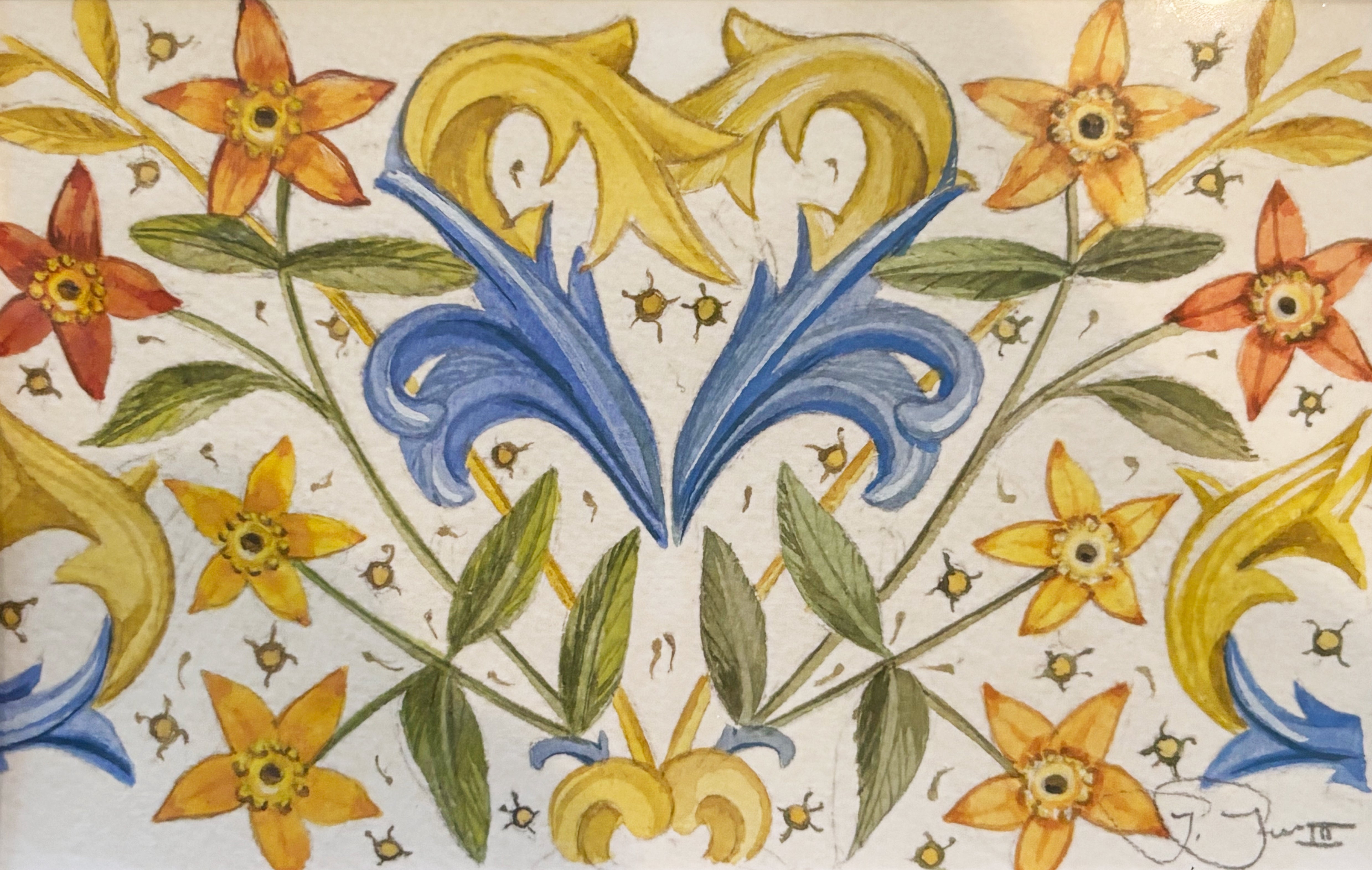 Carefully arranged blossoms, curling leaves, and flourishes of blue and gold. But as with all things worth noticing, it held something more. The red and yellow petals seemed to lean inward, as if eavesdropping on a secret the center had not yet told. And just between the twin blue arches, like a sigh caught in paint, there it was: Summer’s Breath. Not a wind, not a word—but the moment just before, when everything is still and waiting. One couldn’t say what had happened, only that it had left a trace. And in this design, it remains.