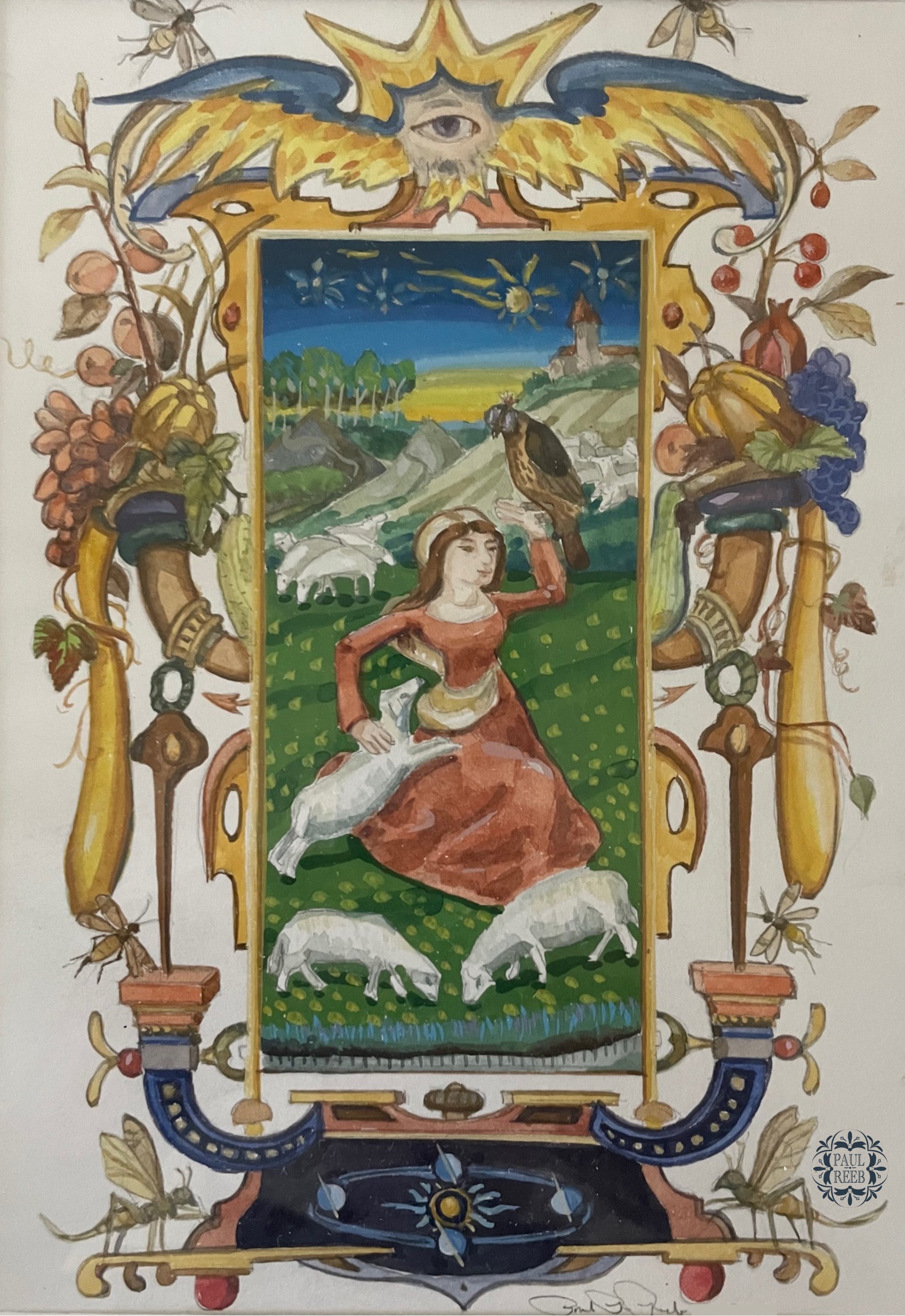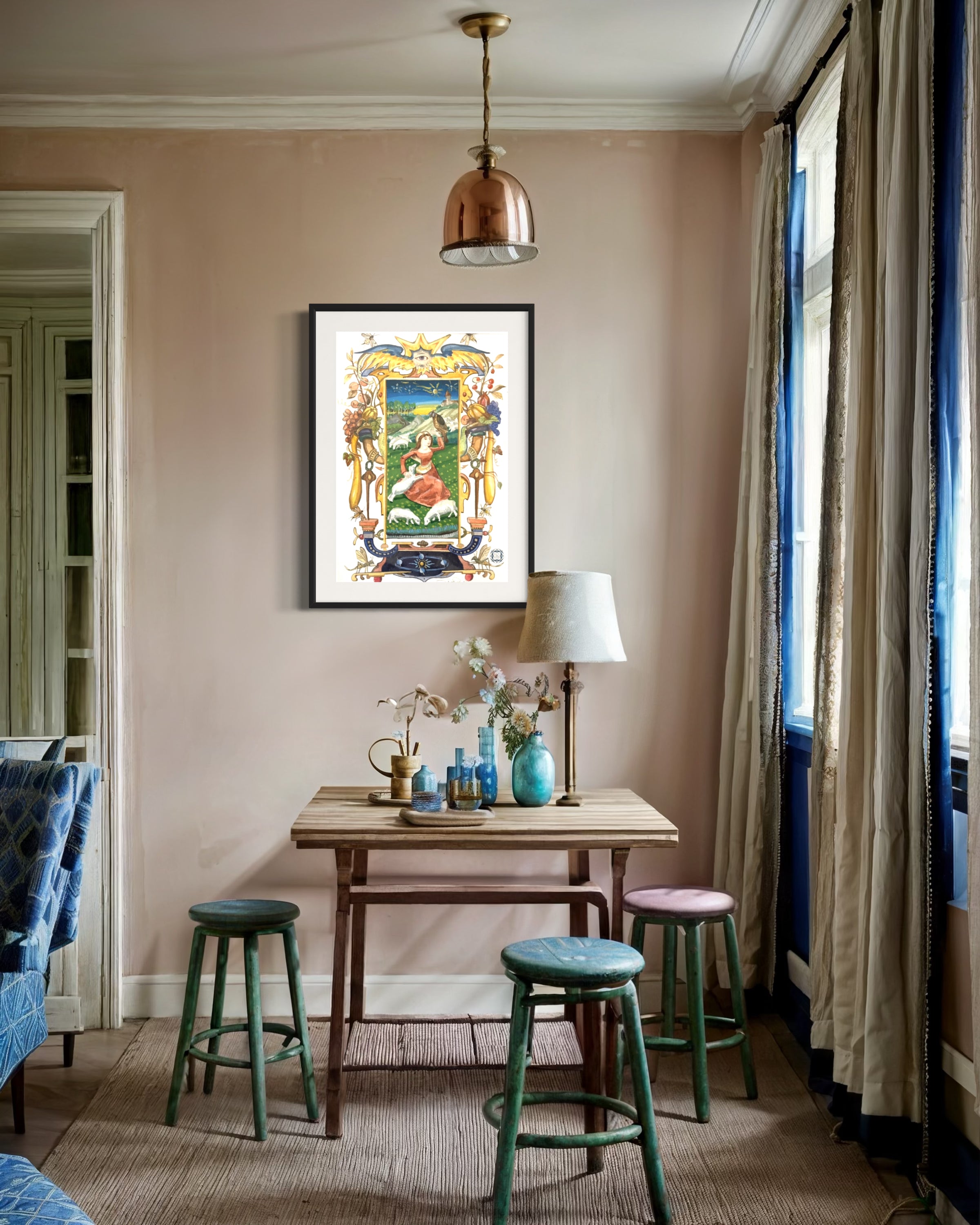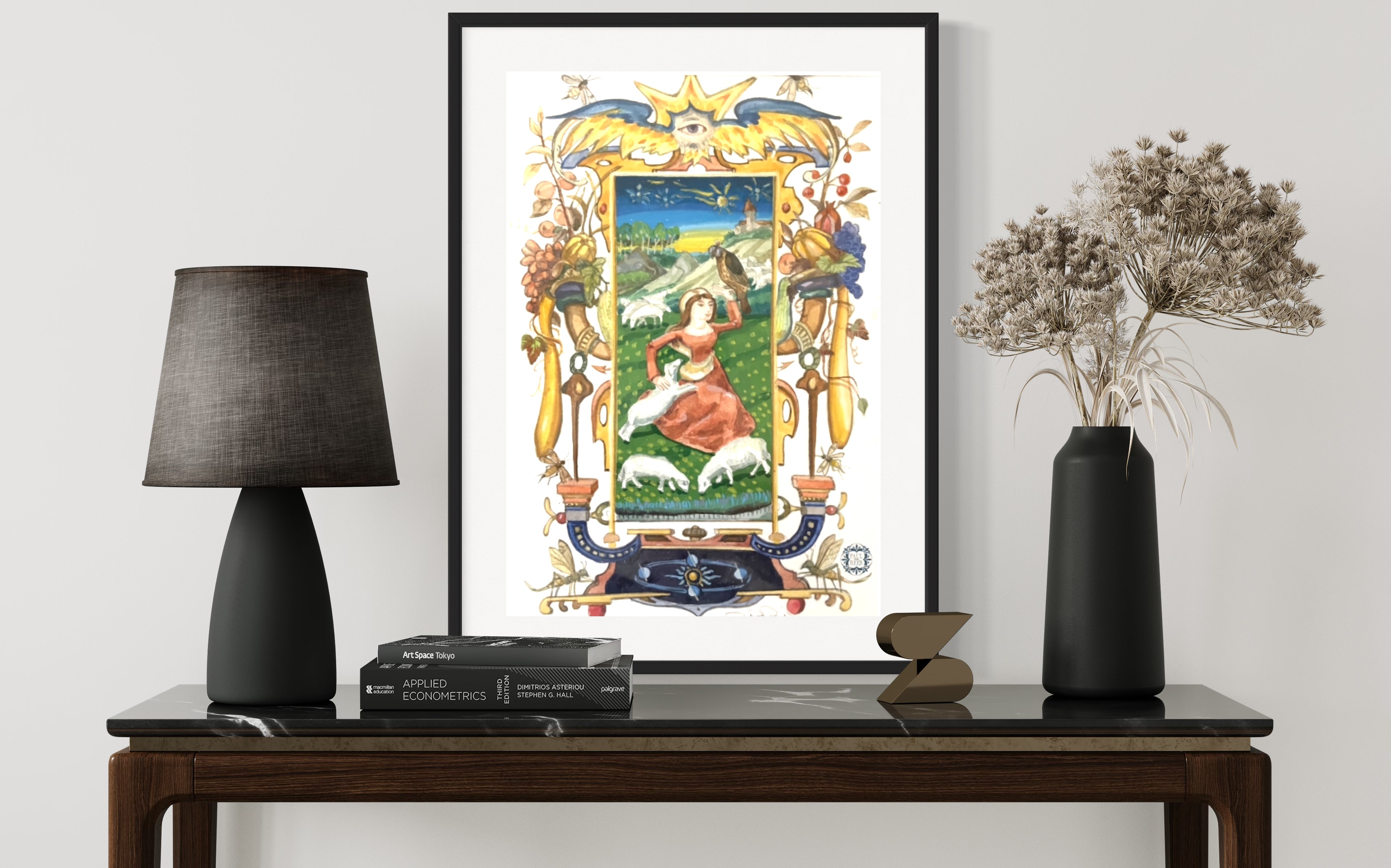 This artwork presents Gaia not as a draped deity but as a living, breathing ecosystem. The soulful eye and celestial wings emphasize her cosmic significance, while the pastoral virtues ground her in everyday life. The layered motifs—agriculture, livestock, insects—form a visual tapestry of interdependence and regenerative cycles.