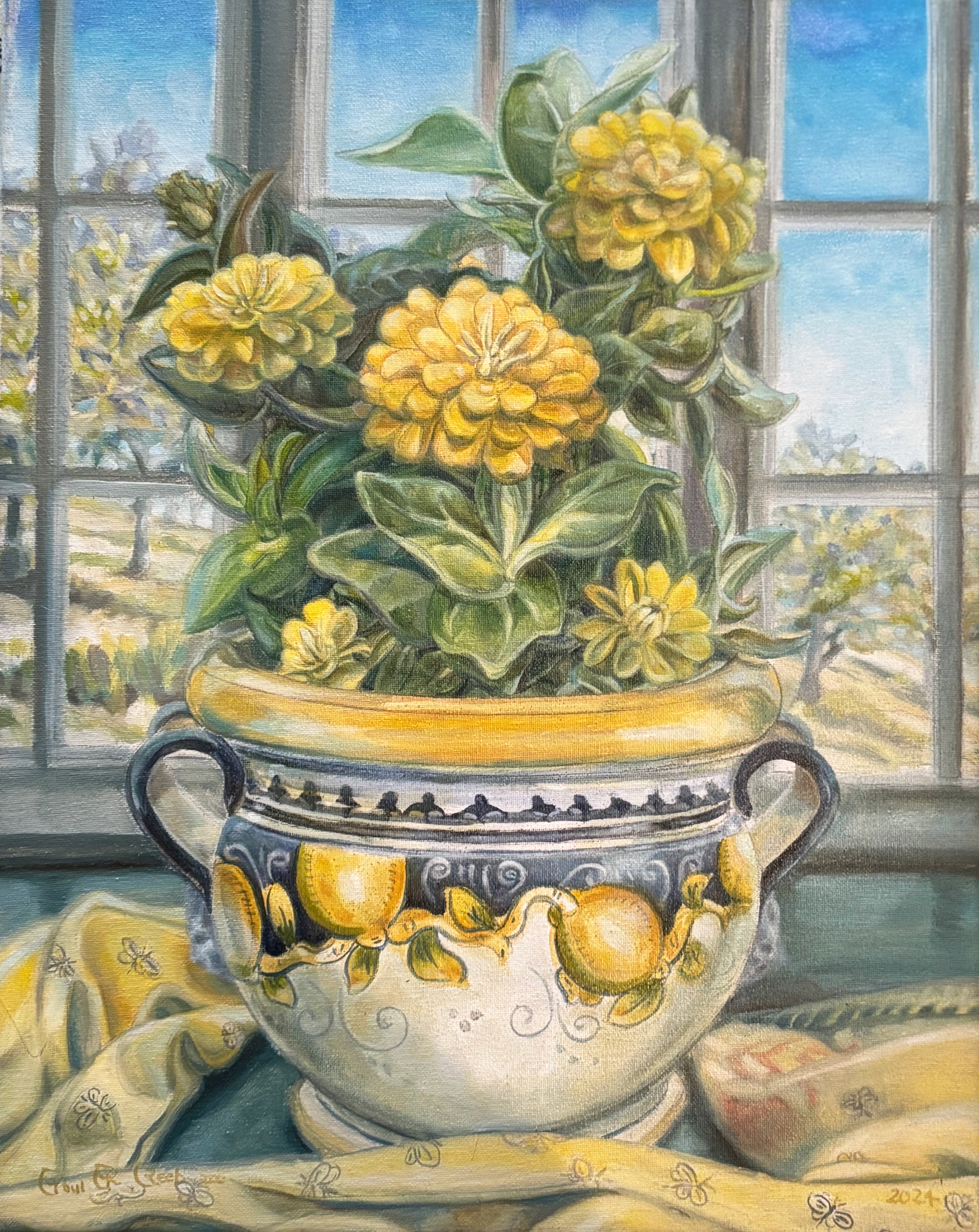 The painting-Italian Light, sat in the solarium of Reeb Manor, directly beneath the long east window where the morning light slanted in like a question left unanswered. It portrayed a luxuriant zinnia plant, golden and impossibly full, blooming in an ornate Italian vessel painted with lemons and looping vines, its handles curved like serpents ready to strike. The pot sat atop a patterned cloth of warm yellows and soft folds, arranged with the same kind of precision one finds in a carefully staged alibi.