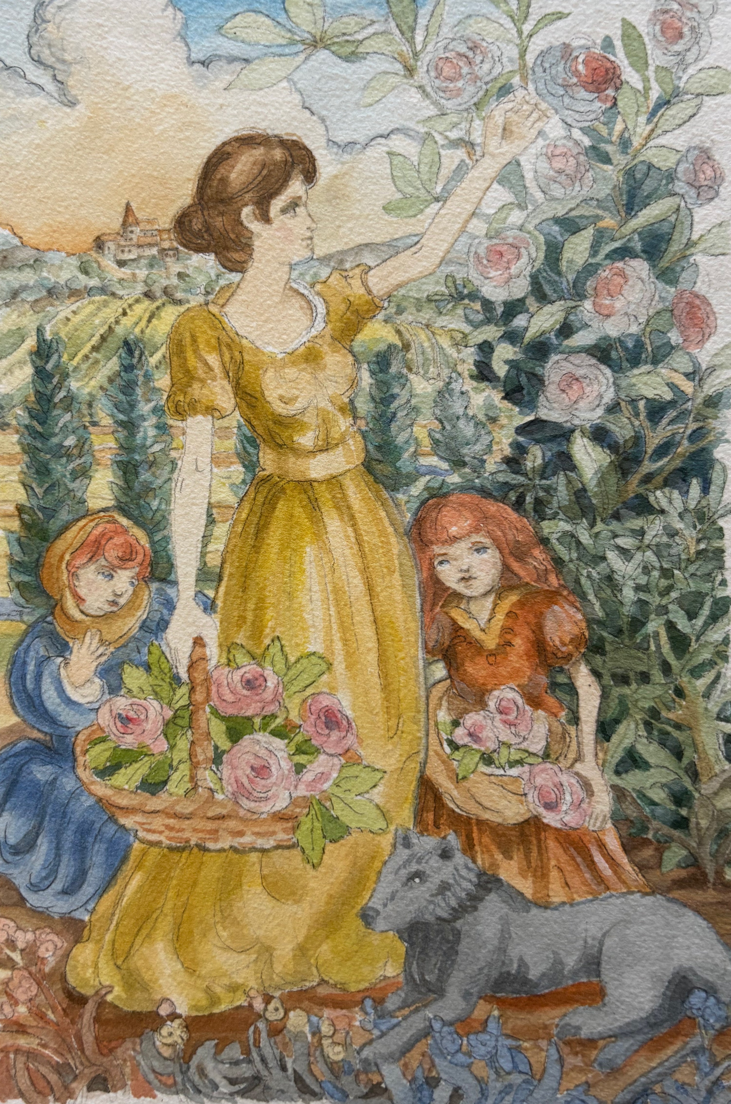 They called them Maiden Flowers, those delicate roses that only grew along the path to the old vineyard estate—blooms said to open only in the presence of women who carried secrets. The young mother reached for one with practiced ease, her daughters watching, hands full of blossoms that had been plucked with more instinct than permission. Behind them, the wolf lay far too still, its eyes half-closed, as though listening for something unsaid. The air was thick with fragrance and some- thing more—a hush that had less to do with the heat, and more to do with what had happened there before. Or perhaps, what was about to happen again.