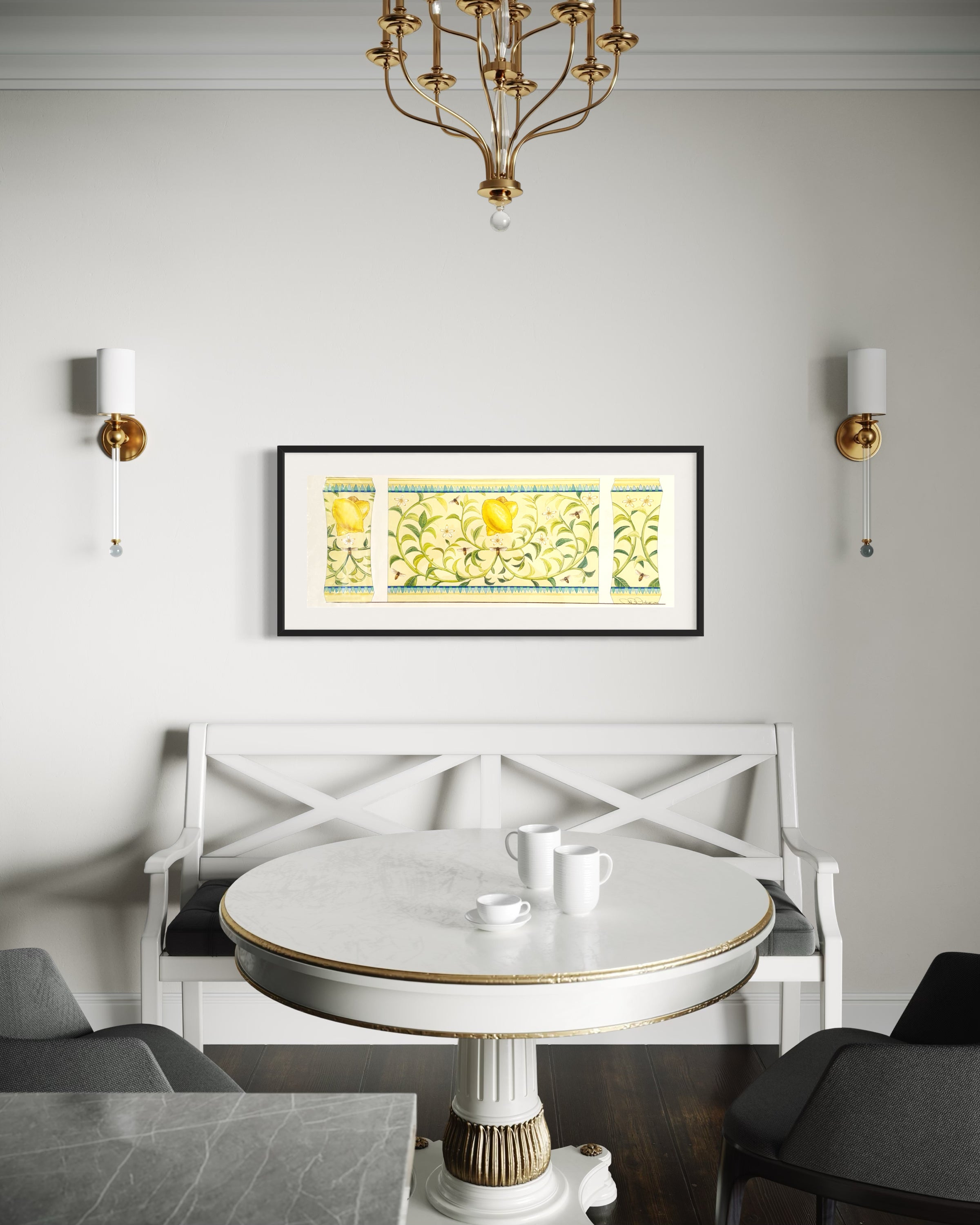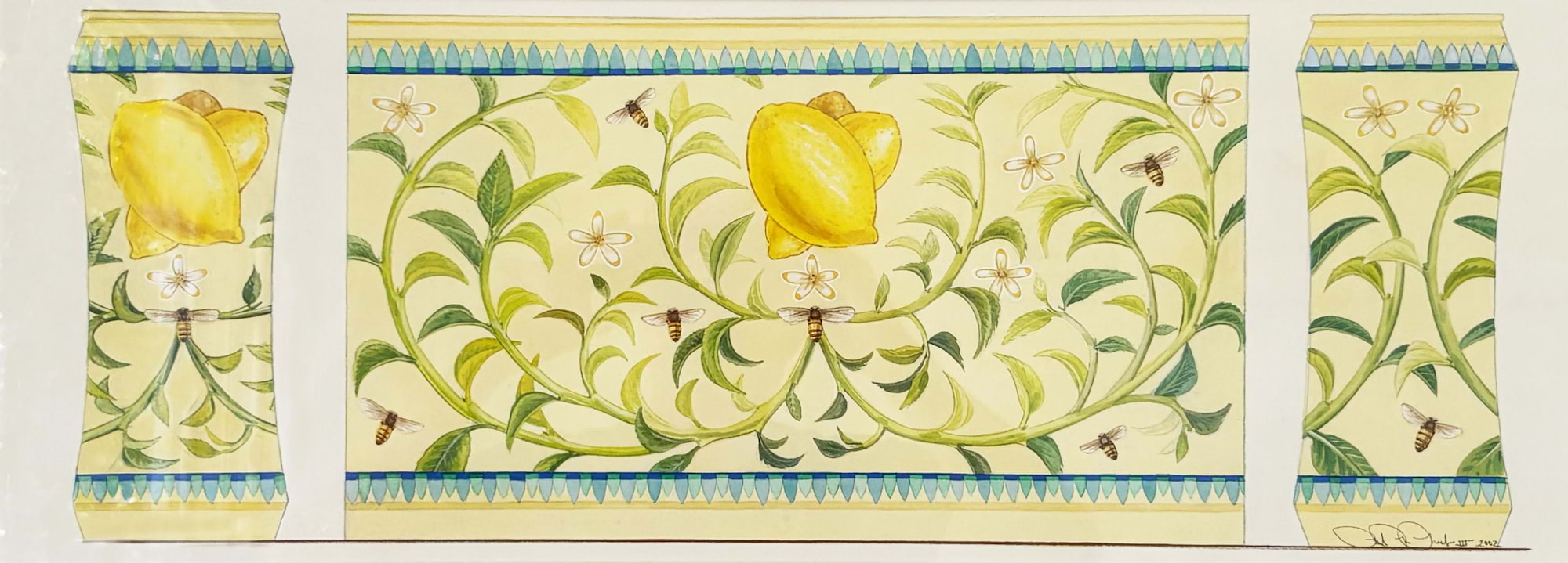 It was the sort of scene one might recall suddenly—in the summer sun—while walking through an overgrown garden or stirring honey into tea. Lemons, golden and heavy with light, nestled among curling vines and delicate white blossoms, while bees hummed their endless secrets between petal and fruit. There was something curiously intentional about the arrangement, as if each leaf had been placed with quiet precision. And though it appeared decorative at first glance, one couldn't quite shake the feeling that a message had been left here, encoded in the symmetry—a message meant only for those who knew how to look.